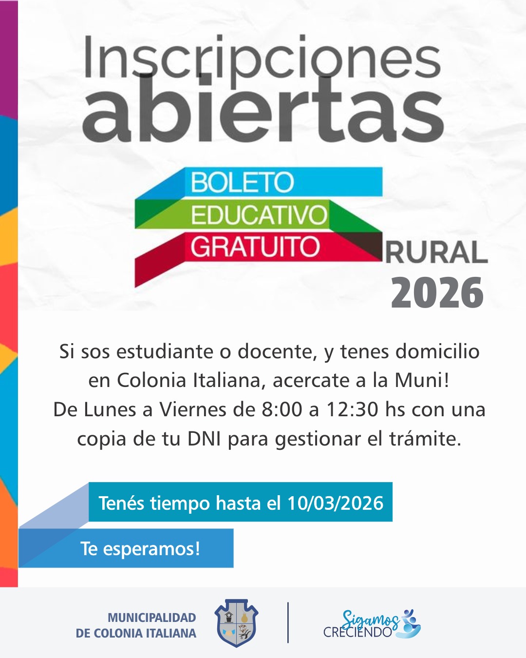 Si sos estudiante o docente, y tenes domicilio en Colonia Italiana, acercate a la Muni!