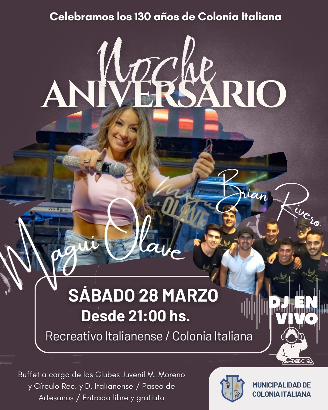Sábado 28 de Marzo desde las 21:00hs en el club Rec. y Dep. Italianense festejamos nuestro Aniversario con Magui Olave y más Artistas en escenario.